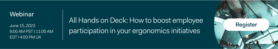 Employee participation is crucial for your organization’s overall success and incorporating these strategies will help you build a strong participatory ergonomics program that minimizes risks, enhances employee satisfaction, saves money, and allows employees to tackle more complex ergonomics challenges. To learn more about employee participation within ergonomics programs, register for our webinar, All hands on deck: How to boost employee participation in your ergonomics initiatives.