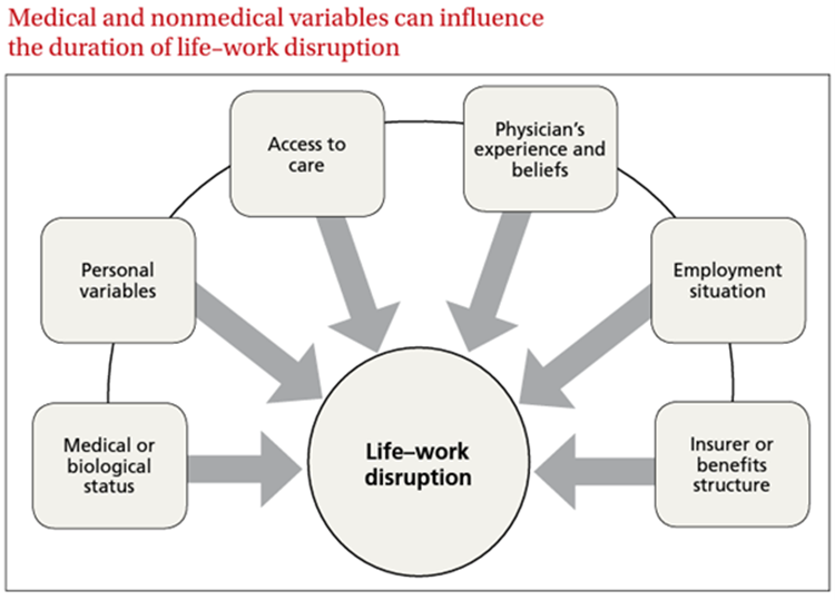 Think about all of the medical and nonmedical variables that influence the duration of life-work disruption. Case managers are generally the only people that are reaching into each of these buckets to help patients. Therefore, using evidence-based guidelines to assist these different conversations can help quickly narrow down topics that are most relevant to the patient and their diagnosis. This also can help advise the patient on how to advocate for themselves, which is especially important when they talk to their employer about stay-at-work or return to work (RTW) options, which is really unique to case management.